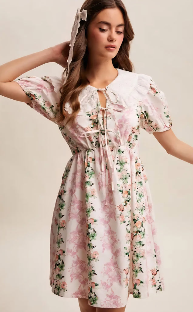Floral puff sleeve mini dress with eyelet lace collar with delicate embroidery and soft ruffle edges