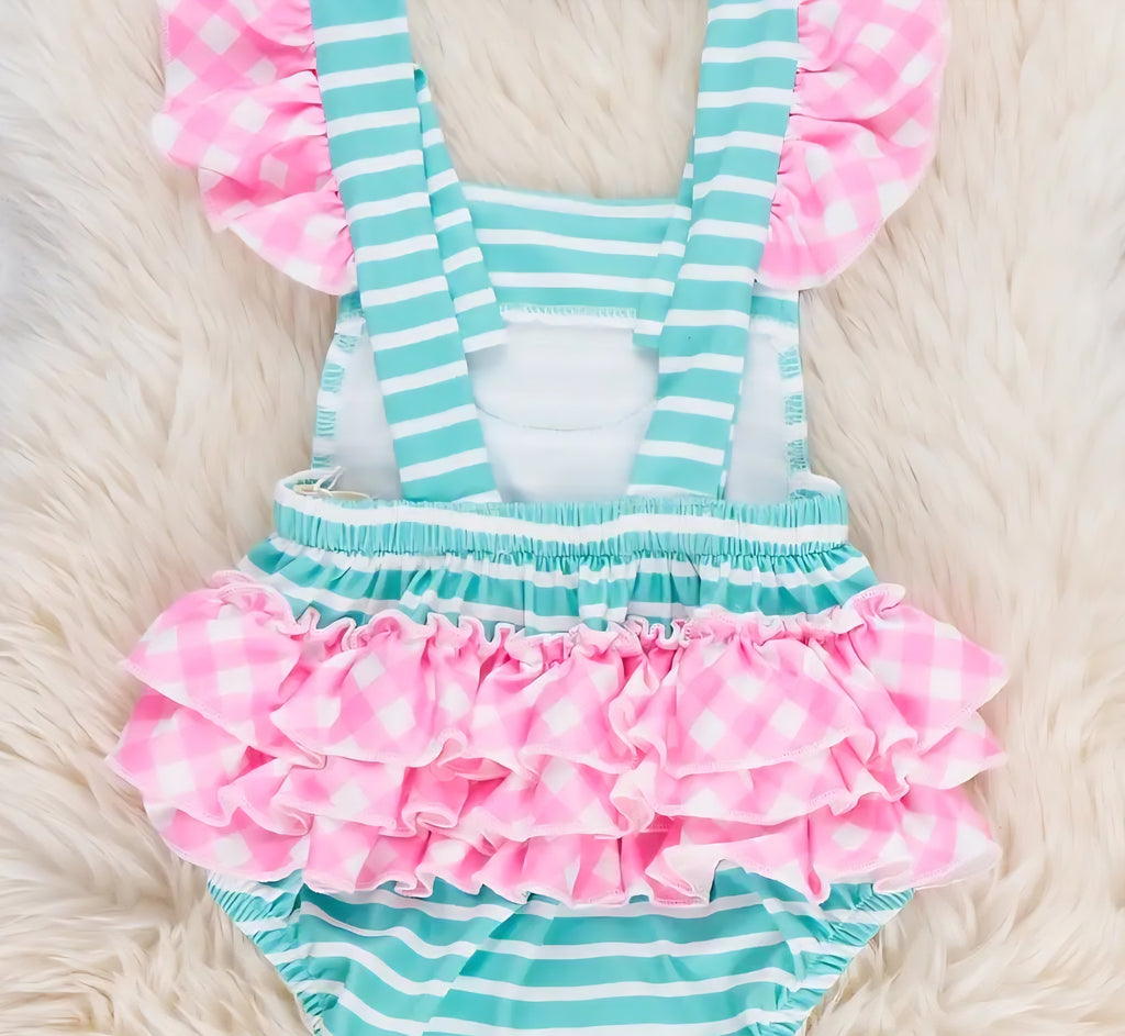 Bubble includes a striped bodice bearing an embroidered watermelon detail and gingham ruffle butt for super cuteness.